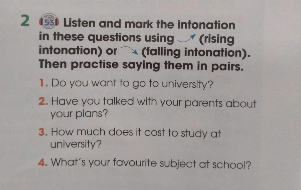 Listen and mark the intonation in these questions, using (rising intonation) or (falling intonation). Then practise saying them in pairs. (Nghe và đánh dấu ngữ điệu trong những câu hỏi này, sử dụng (tăng ngữ điệu) hoặc (giảm ngữ điệu). Sau đó thực hành nói chúng theo cặp)