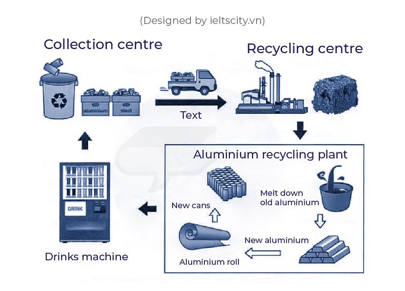 Task 1: The diagram below show the stages in the recycling of aluminum drinks can. Summarize the information by selecting and reporting the main features, and make comparisons where relevant.
