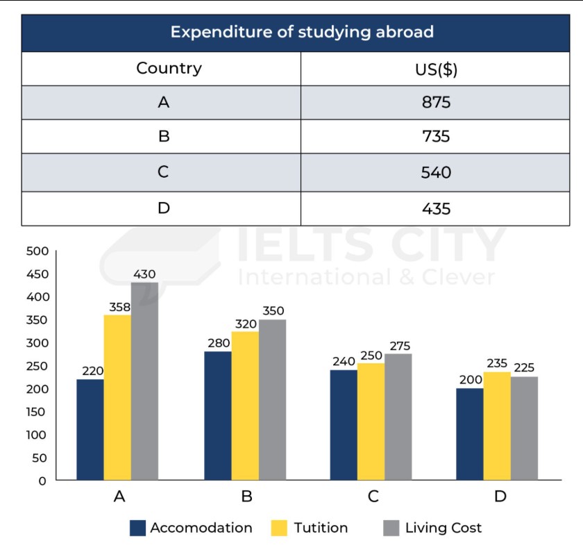 Task 1: The table and the chart below provide a breakdown of the total expenditure and the average amount of money spent by students per week while studying abroad in 4 countries. Summarize the information by selecting and reporting the main features, and make comparisons where relevant.