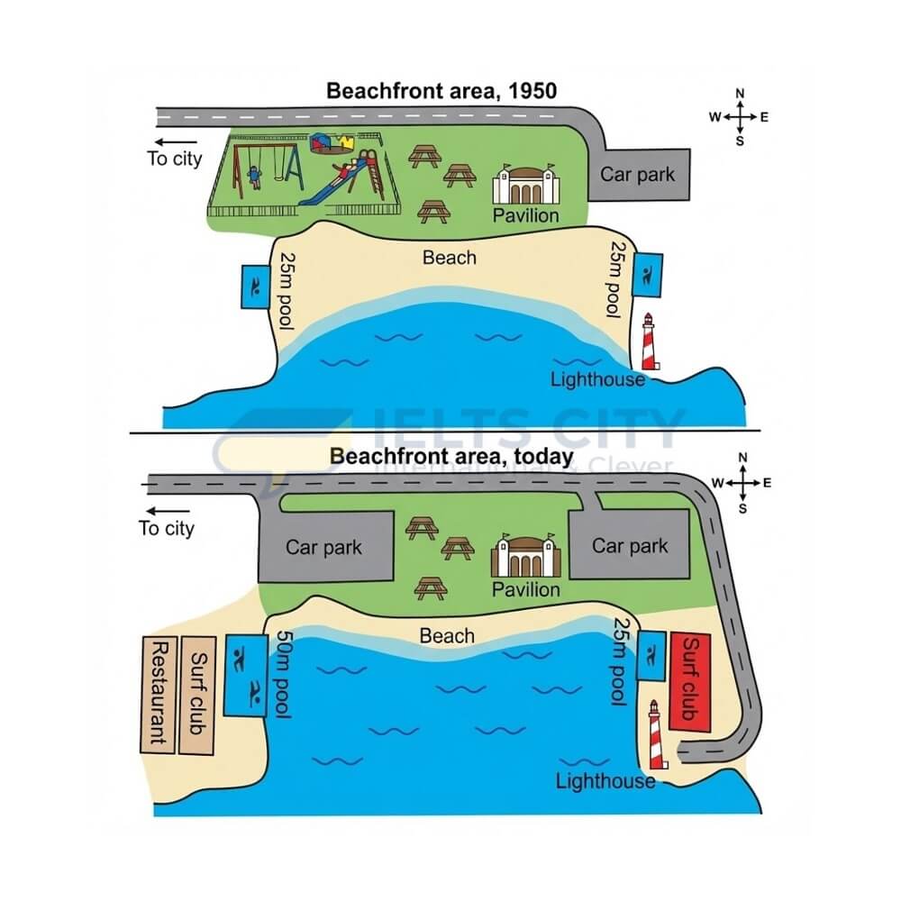 Task 1: The maps below show a beachfront area in Australia in 1950 and the same area today.