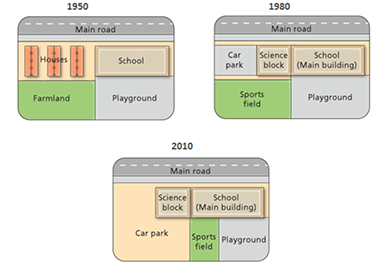 The diagrams below show the changes that have taken place at West park Secondary School since its construction in 1950.