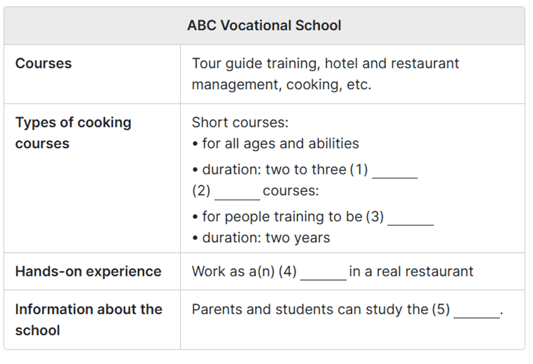 Listen to the conversation again and complete the notes below. Use no more than TWO words for each gap. (Nghe đoạn hội thoại một lần nữa và hoàn thành các ghi chú dưới đây. Sử dụng không quá HAI từ cho mỗi chỗ trống.)