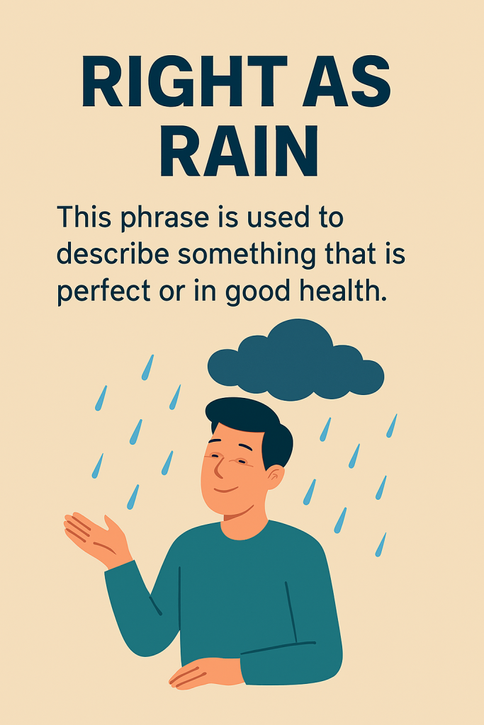 “Right as rain” là một thành ngữ mang nghĩa ổn định, khỏe mạnh hoặc hoàn hảo, thường dùng để mô tả sức khỏe hoặc tình trạng tốt của một vật hoặc tình huống. Dù người Anh không thích mưa, cụm từ này lại rất phổ biến trong văn nói hàng ngày.